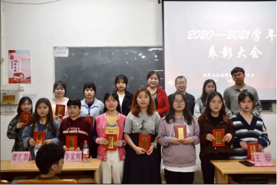 2021年3月26日晚7点,法学与公共管理学院(以下简称法管学院)学生会年度表彰大会在明理楼N405教室隆重举行。出席此次大会的人员有法管学院党总支副书记王珍老师,法管学院团委书记刘涛老师,法管学院学生会团委副书记李家辉、曹汇慧,法管学院学生会主席沈惠冰以及法管学院学生会全体成员。此次会议由学生会成员梁春春同学主持。