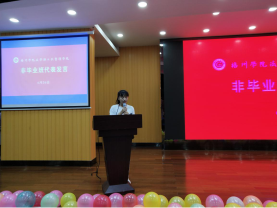 在17级公共管理班吴宵洁演唱了《耿耿于怀》后,18法学1班的郑兴媚代表非毕业班做出了发言。郑兴媚同学对法管学院的毕业生表示了最衷心的祝福与最美好的期愿,希望毕业生可以拥有一个美好的明天,并表示将会以毕业生作为学习的榜样。郑兴媚同学的演讲中说到,通向成功的路有千万条,希望毕业生们可以放飞梦想,去创造更辉煌的未来,梧州学院将以有他们为荣。