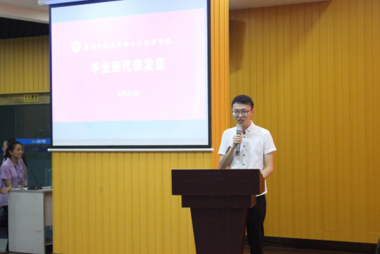 法管学院15级公共事业管理班代表农智深回顾四年大学生活充满了感慨与怀念,他思考了以往自己大学生活的点点滴滴,并希望在后来的日子可以相互促进,共同进步。他对法管学院的老师与同学们表示了感谢,也感叹自己的人生踏上了新征程,并希望以后可以为母校争光,让母校以他为荣。