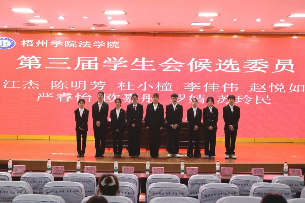 大会经过公平公正选举产生江杰、陈明芳、杜小橦、李佳伟、赵悦如、严睿怡、欧嘉彤、罗婧、苏玲民为法学院第三届学生委员会委员。为法学院的发展注入新鲜血液与力量,为续写新辉煌接续奋斗。
