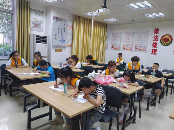随着时间的流逝,越来越多的小朋友接踵而来,他们当中有调皮的,有文静的,也有爱玩儿的,志愿者们帮助他们完成自己相应的作业,并细心耐心地教导着。逐渐地外面的太阳越来越炽热,好在室内有空调,赶走了闷热,让这不大不小的教室中充满着清凉还有一丝温暖……