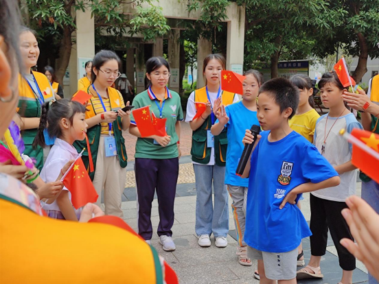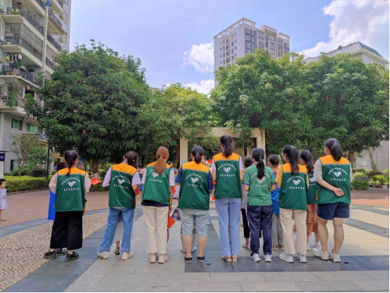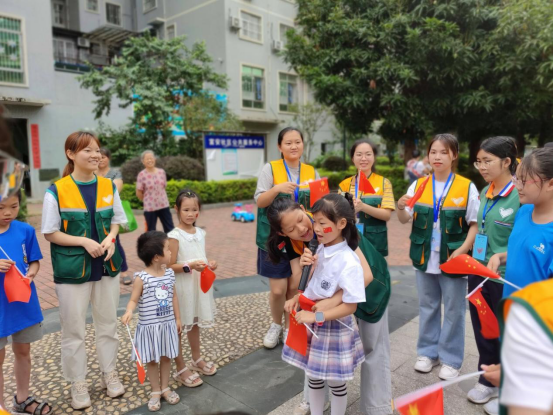 第一节课就要结束了,但有的小朋友才刚刚到达,志愿者们便继续留在教室进行辅导,课间休息15分钟后开始了第二节课,其余志愿者以及小朋友们去到附近的小广场,进行“歌唱祖国歌唱党,快乐童年大家唱”的活动。首先由负责人分发小红旗以及贴纸给所有志愿者和小朋友们,接下来由主持人教唱《团结就是力量》、《我们是共产主义接班人》,让小朋友们以及志愿者们在歌曲中感受红色文化经典,在声音中传递力量。小区里回荡着响亮的歌声,其他小朋友们闻声而来,加入了这个温暖的团体。