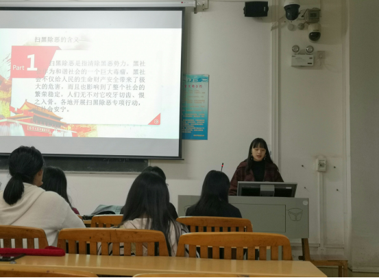 会议在下午5:40开始,同学们提前到达教室并且签到完毕后,由温惠钧同学通过PPT向全体同学们讲解了“扫黑除恶”的含义、诈骗类型等,还讲述了一些相关案例。黑恶势力作为和谐社会的一个巨大恶瘤,不旦给人民的生命财产安全带来了极大的危害,也影响到了整个社会的繁荣稳定。近年来,公职人员是国家重点打击的对象,各地都纷纷展开了形式多样的扫黑除恶专项活动,打击恶势力,打击腐败现象。最后主持人向大家展示了有关扫黑除恶的举报方式和举报电话,同学们用手机拍照记录下来,当遇到恶势力可以通过这些方式向相关部门举报,维护社会安定。