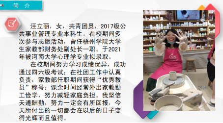 为满足我院大二年级同学对考研情况的了解,进一步提高我院同学的考研热情,更多了解考研信息,掌握考研技巧。6月11日上午8点20分,在教室S604教室举办考研经验分享会,会议特邀由我院分别考入河南大学的汪立丽、福建师范大学的徐忆爱、广西师范大学的黎冬艳三名2021届毕业生作考研经验分享。会议由辅导员黎冬燕老师主持。