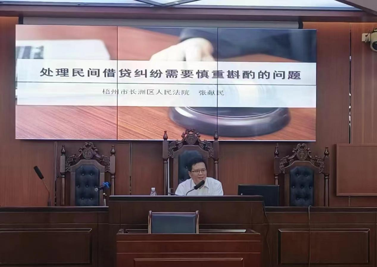 10月11日下午15:00,梧州市长洲区人民法院党组书记、院长张献民在法学院模拟法庭,为法学院2022级学生作“处理民间借贷纠纷需要慎重斟酌的问题”法治专题讲座。会议由梧州学院国际经贸与法律研究院院长白续辉博士主持,法学院2022级全体学生参加了本次专题讲座。