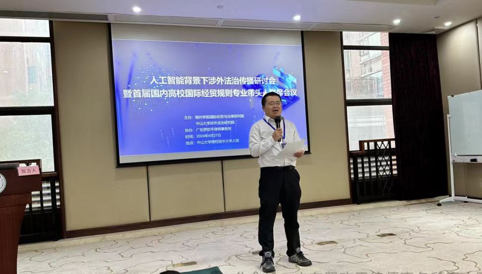 2024年4月27日,“人工智能背景下涉外法治传播研讨会暨首届国内高校国际经贸规则专业带头人联席会议”在广州中大学人馆顺利举行。本次会议由我校国际经贸与法律研究院与中山大学涉外法治研究院联合主办、广东罗欢平律师事务所协办。中山大学、自然资源部南海局、广东省人工智能法律应用重点实验室、西安交通大学、上海对外经贸大学、广东财经大学、桂林电子科技大学、广西警察学院、山东政法学院和国内相关头部短视频平台、头部社交媒体、知名法律人工智能公司、优秀互联网律所等单位的三十余名专家学者和实务界人士出席会议。
