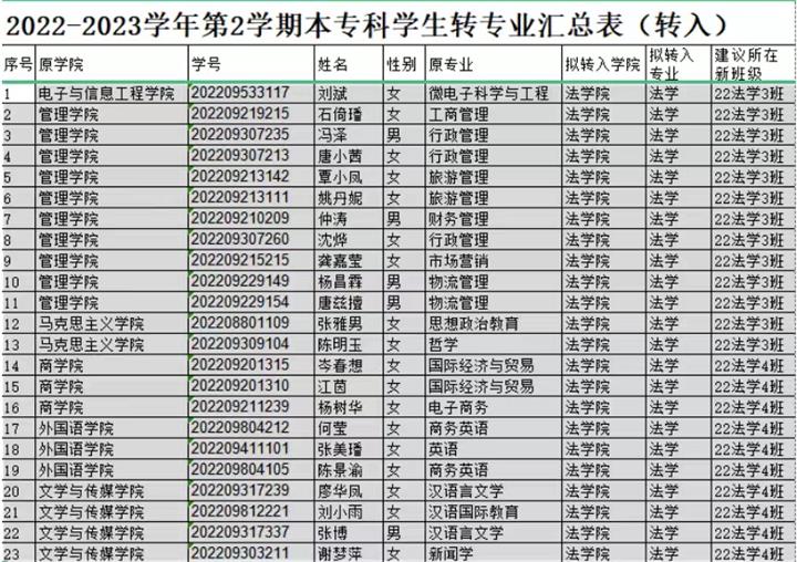 根据教育部《普通高等学校学生管理规定》(教育部第41号令)、《高等学校学生学籍学历电子注册方法》(教学〔2014〕11号)、《梧州学院学生管理规定(修订)》(梧院学〔2017〕283号)以及《梧州学院转专业管理办法(修订)》(梧院学〔2019〕17号),经过学生本人申请、学院面试、我院评审委员会审议,按照公开、公平、公正的原则组织评议,同意以下23名同学转入法学院,现将名单予以公示如下: