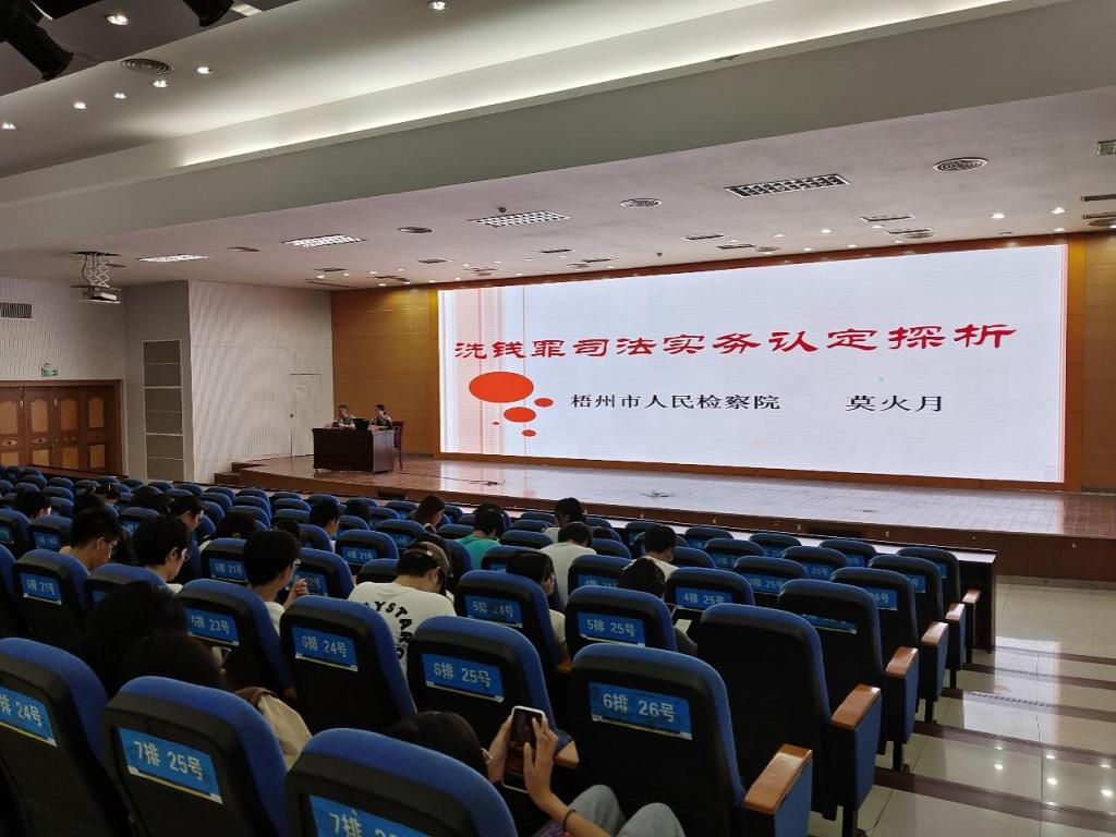 11月11日晚,法学院在明理楼学术报告厅举办了“法治大讲堂”系列讲座第5期。讲座由梧州市人民检察院第三检查部莫火月主任主讲,王湘平博士主持,法学院2021、2022级法学专业全体同学和部分教师参加。 在讲座中,主讲人莫火月主任向同学们讲述了六个方面的知识:洗钱的概念、反洗钱工作的重要意义、洗钱犯罪的立法演变、他洗钱犯罪问题、自洗钱犯罪问题、洗钱罪与关联犯罪。 莫火月主任讲得生动,同学们听得认真,每个内容都深入同学们的内心,这样的讲座让同学们受益匪浅。 [文/图:李明宇]