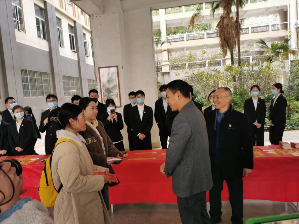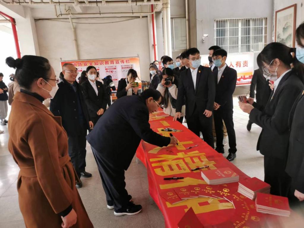 在启动仪式上,学校领导向同学们赠阅了《中华人民共和国宪法》、《中华人民共和国民法典》等法律文本,向同学们宣传尊崇宪法、学习宪法、遵守宪法、维护宪法、运用宪法的重要意义,希望同学们弘扬宪法精神,做一名认真“学习贯彻党的二十大精神,自觉维护宪法权威”的当代大学生,更好地推进中国特色社会主义法治建设。随后,学校领导、广大师生在宣传横幅上签名,以庄重的仪式表达对宪法的一个承诺,做一名与法同行的公民。