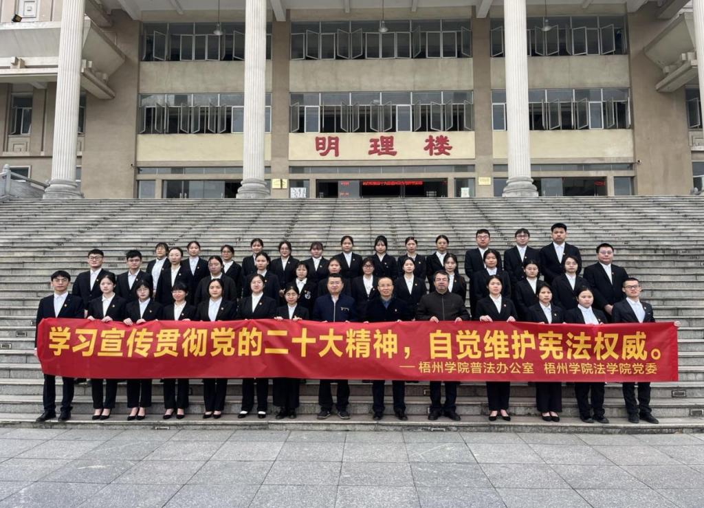 2022年12月8日,由梧州学院普法办与法学院党委共同主办的“学习贯彻党的二十大精神,自觉维护宪法权威”为主题的“宪法宣传周”启动仪式在明理楼一楼举行,学校党委书记韦仕珍、副校长邱房贵、宾月景、范生汝等领导参加启动仪式。
