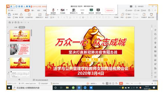 在当前疫情防控特殊时期,为认真贯彻落实习近平总书记系列重要指示精神和中央、自治区、梧州市的有关决策部署,落实学校疫情防控工作措施,法学与公共管理学院教师党支部于2020年3月4号下午4:30采用腾讯会议网络平台召开了“党旗飘扬,共同战疫”网络主题党日活动会议,会议由教师支部副书记黄菲主持,支部全体党员教师参加了网络会议。