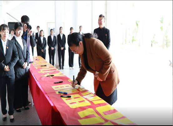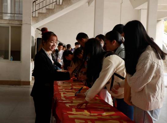 韦仕珍号召广大师生深入学习宣传习近平法治思想,大力弘扬宪法精神,在全校形成尊法学法守法用法的良好氛围。广大师生积极参与此次活动,并在宣传横幅上签名。