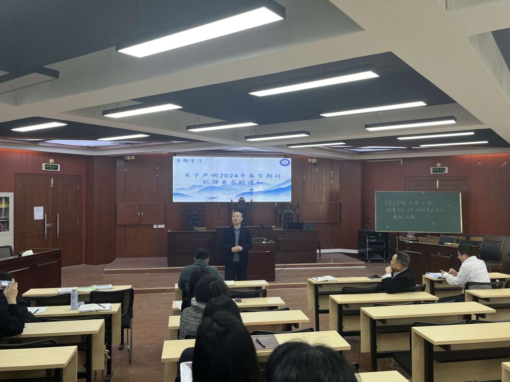 2024年1月14日,法学院在N603召开了清廉学校建设专题学习会,学院全体教职员工参加学习。会上,学院党委书记黎祖立同志传达了梧州学院纪委印发的《关于严明2024年春节期间纪律要求的通知》精神,要求全体教职员工深入贯彻落实中央八项规定精神,抓好抓实节假日期间作风建设,弘扬清风正气,营造良好节日氛围,严防“四风”问题反弹,做到廉洁奉公、守好廉洁关口。会后还组织全体教职工观看了电视专题片《持续发力 纵深推进》第三集《强化正风肃纪》。