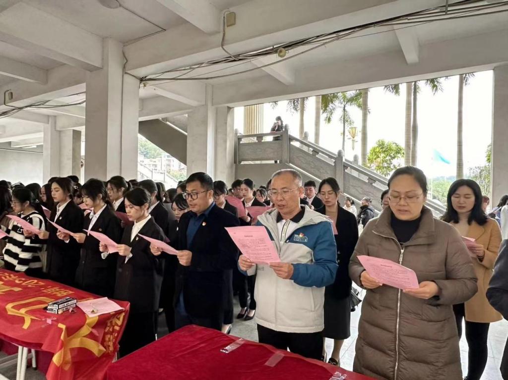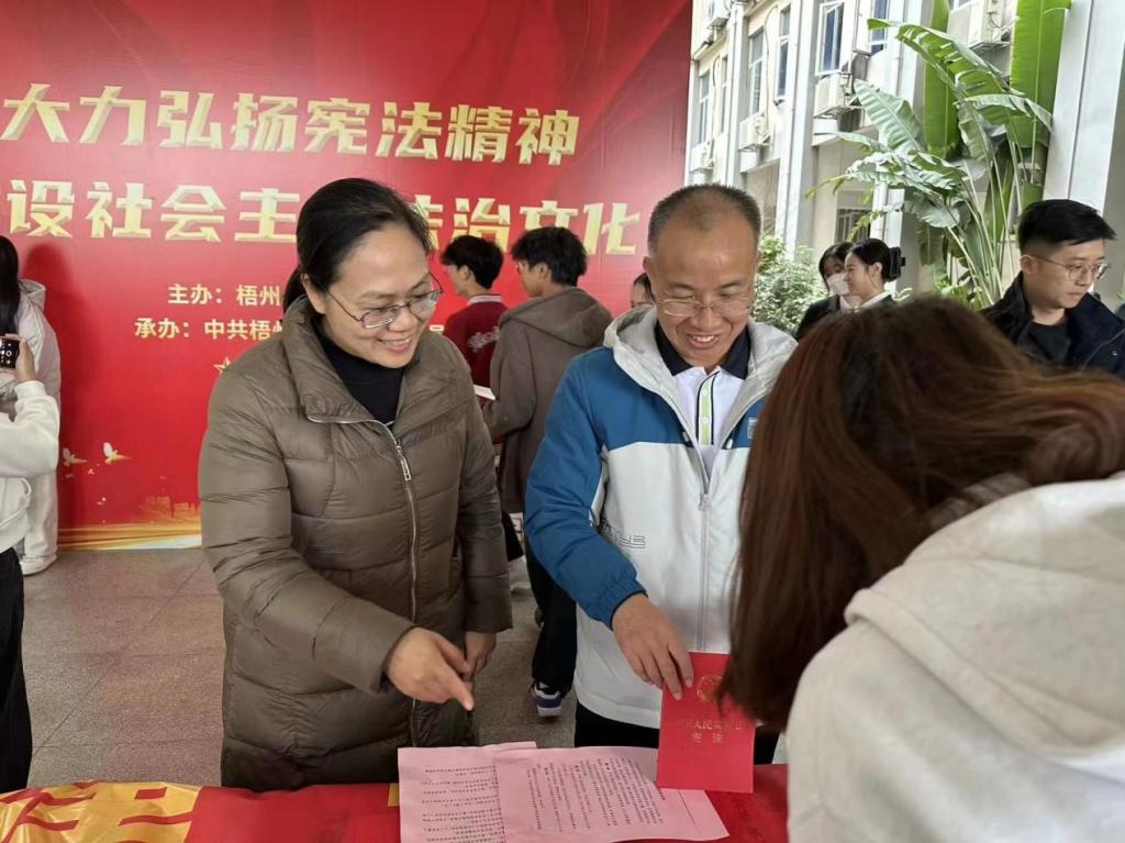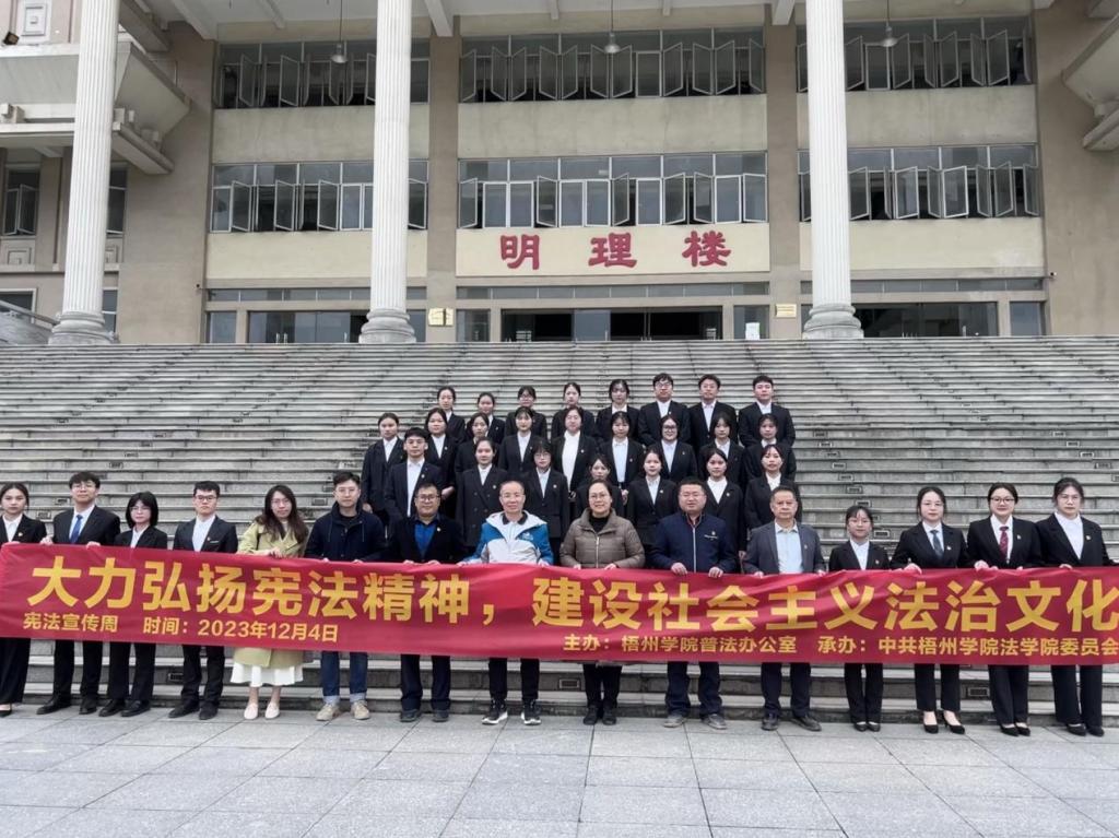 2023年12月4日是第十个国家宪法日,为普及宪法知识,“大力弘扬宪法精神,建设社会主义法治文化”,进一步增强广大师学生的宪法意识,梧州学院普法办、法学院党委在明理楼前共同开展面向全校师生的2023年“宪法宣传周”启动仪式暨宪法晨读活动。启动仪式上,老师与同学们纷纷在横幅上签字表达对宪法的尊崇与热爱,活动组织者同时还向师生赠阅《中华人民共和国宪法》、《中华人民共和国民法典》等书籍,进一步营造全民尊法学法守法用法的氛围。“宪法宣传周”活动期间,还将在学校A4路口等地方设点宣传,活动采取发放普法手册、现场讲解、宪法知识竞答等多种方式进行,活动内容丰富,激发广大师生的参与热情,让宪法精神在全体同学心中落地生根。