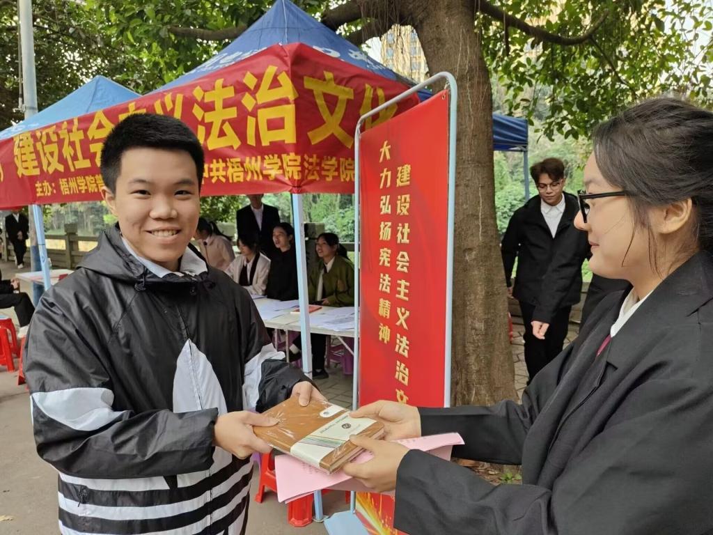 为了迎接我国第十个国家宪法日,切实加强法治宣传,提高大学生宪法学习意识,梧州学院法学院学生第一、第二党支部于2023年12月4日在a4路口、明理楼一楼举办了“律政之星”法治宣传摆点活动。