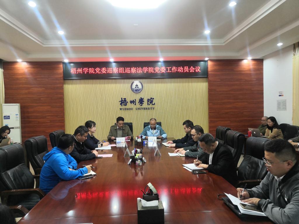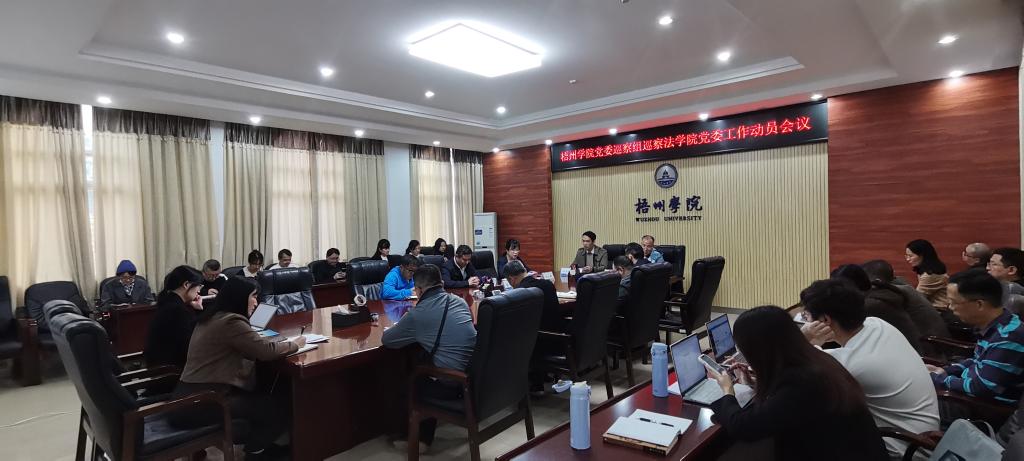 11月29日下午,学校党委巡察组在明理楼八楼第二会议室召开梧州学院巡察组巡察法学院党委工作动员会议。会议由法学院党委书记黎祖立主持,学校党委巡察工作领导小组成员叶子琛、巡察组组长许玉婷、副组长莫智懿及巡察组全体成员、法学院全体教职员工参会。