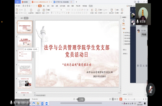 为深入贯彻自治区党委组织部《关于加强对党忠诚教育的意见》文件精神,强化党员政治品质,2021年3月20日,法学与公共管理学院学生党支部采取腾讯会议线上学习的形式,开展“我的忠诚观”微党课——学习第一书记杨明威的驻村扶贫事迹,党课由谢玉珊同志讲述,支部全体成员参与学习。