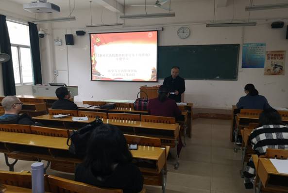为深入学习宣传党的十九大精神和习近平新时代中国特色社会主义思想,进一步贯彻落实全国教育大会精神,深化师德师风建设,提升法管学院广大教职工的师德水平,12月26日下午,法管学院党总支在M201教室召开学习教育部《新时代高校教师职业行为十项准则》专题学习会。会议由党总支书记黎祖立主持,全体教职工参加会议。