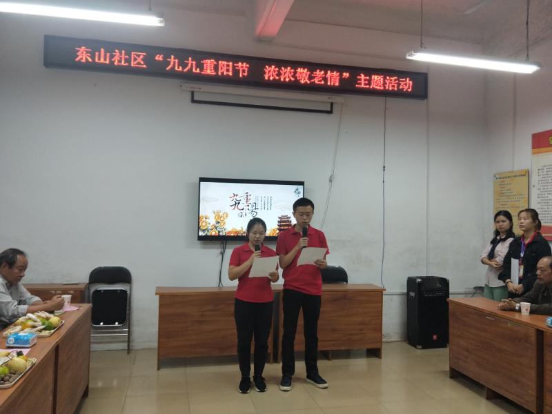 本次活动共有6个节目,由梧州学院法学与公共管理学院学生党建工作服务管理中心的成员楼奕璐主持,活动在梧州市统计局的《岁岁重阳今又重阳》朗诵声中拉开序幕,接着是梧州学院法学与公共管理学院的诗歌朗诵《采桑子重阳》,“人生易老老天难老,岁岁重阳……寥廓江天万里霜。”梧州学院学子的朗诵带给了老党员们无比的感触,人也许无法阻止衰老,那不是春天的光辉,却胜过春天的光芒,梧州学院学子为此次活动增添了青春活力。然后便是梧州市公安局交通警察支队的交通安全知识宣传,为社区老人们解惑答疑。之后梧州市中西医结合医院第一党支队也准备了一首《喜帖街》为各位社区老老党员送上祝福。随后便是有奖问答环节,问答时社区老党员们都非常活跃,场上气氛非常热烈。为了提高老党员们的警惕性,防治老人被骗,市区农村信用合作联社为老党员们讲解假币与真币的区别方法,预防老党员们被骗。最后社区老党员王日东同志为社区老人们献唱歌曲《天边》、《我在纳林湖等着你》,气氛非常活跃,社区老党员们非常高兴。