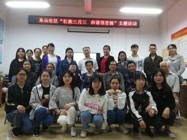 为了弘扬民族文化,传承传统民族文化的内涵,拓展民族文化视野,激发文化认同和民族自信,增进与社区的交流活动,法学与公共管理学院(以下简称:法管学院)党总支于3月31日上午在东山社区开展壮乡“三月三”系列活动,东山社区的老人、东山社区负责人骆思宁、法管学院党总支书记黎祖立、法管学院党总支副书记王珍和法管学院党总支党员参加了此次活动。