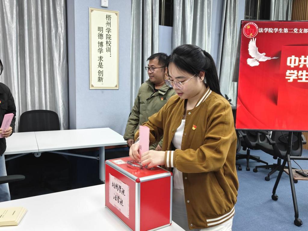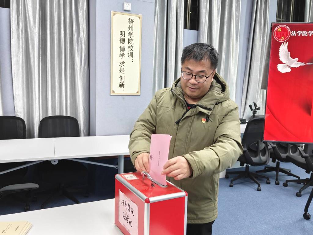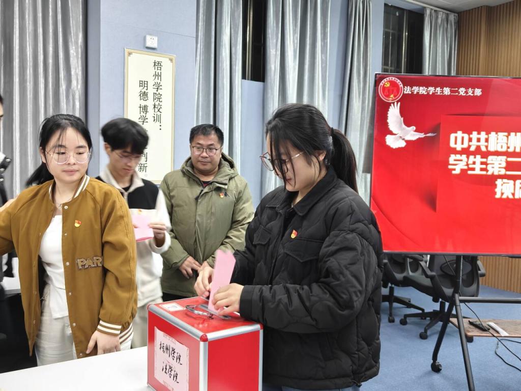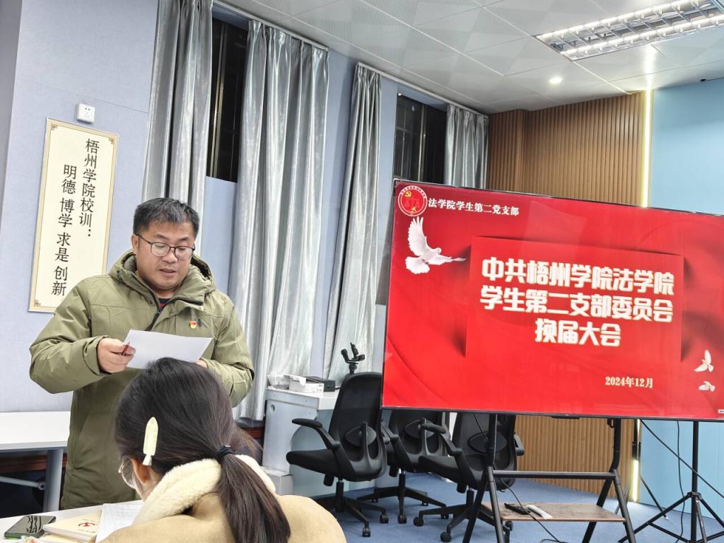 为了加强支部委员会的自身建设,提高党支部的战斗力,发挥党支部战斗堡垒作用的关键。2024年12月24日,法学院学生第二党支部在明理楼一楼党员活动室召开了“中共梧州学院法学院学生第二支部委员会换届大会”。此次会议由支部书记何剑主持,支部委员会同志全体参加。