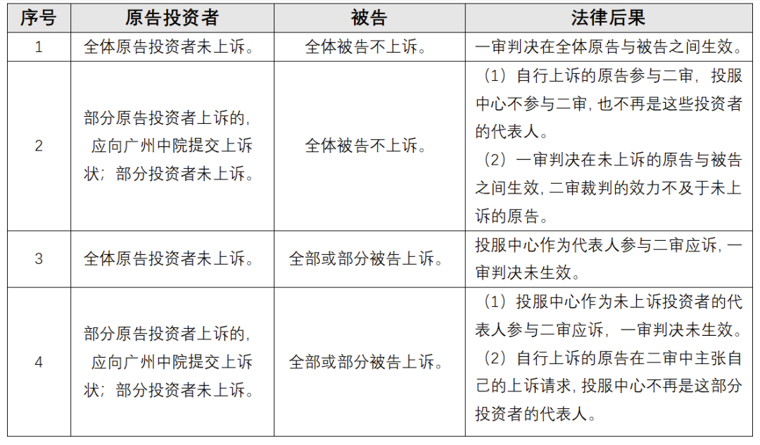 (2)不上诉的后果。投服中心作为诉讼代表人决定不上诉,并不意味着原告一定要选择不上诉,而且还要考虑被告是否上诉的情况。投服中心制作了一个表格来形象地说明不同情况下的法律后果: