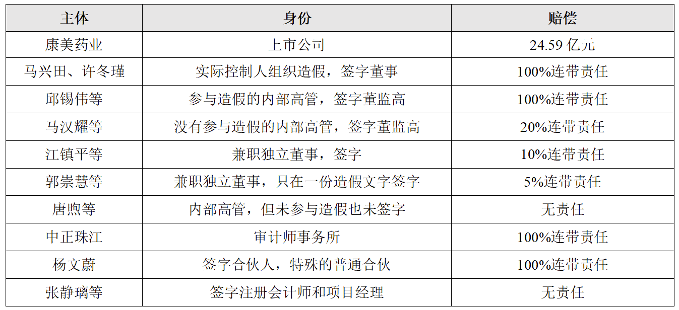 在本案中,法院对各方主体做出了明确的区分:上市公司、实际控制人和直接参与造假的高管、董事承担100%责任,审计师承担100%责任,未参与造假的董事高管还按照其过错程度不同而区分了不同比例的连带责任: